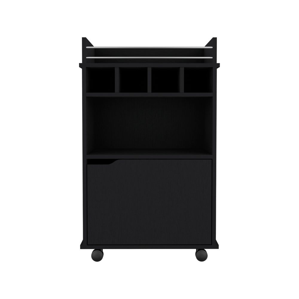 The "Bar Cart Kinsley" combines functionality with style, featuring a black manufactured wood finish that complements any living space. It's designed with a spacious cabinet (19.6"W x 13.5"H), four tailored bottle compartments (4.4"W x 15.7"D x 3.9"H), and an expansive open shelf (19.6"W x 15.5"D), providing ample storage for all your entertaining needs. Mounted on four wheels for effortless mobility, this bar cart ensures your favorite beverages and glassware are always within reach, making it indispensable for any host.Dimensions: Height: 35'Width: 21.6' Depth: 16.3'Furniture Type: Ready to assemble (full assembly required).Certifications: CARB phase II compliant – TSCA Title VI Compliant.Warranty: 1-year warranty coverage in wooden parts- 1-year warranty coverage in hardware pieces since its manufacturing date is found in the lot number printed in the product box.Shipment details: Free shipping to the 48 contiguous states - delivery time: Between 2 and 5 days, depending on the customer's location, season, and weather factors.Other details: This product does not include decorative or background elements; Check that the box is in good condition and well packed and check with the help of the manual that the corresponding parts have been included; For more information regarding warranty, shipment details, cancellations, returns & replacement parts go to the bottom section of our website to learn more; Installation & Assembly Instructions included.
